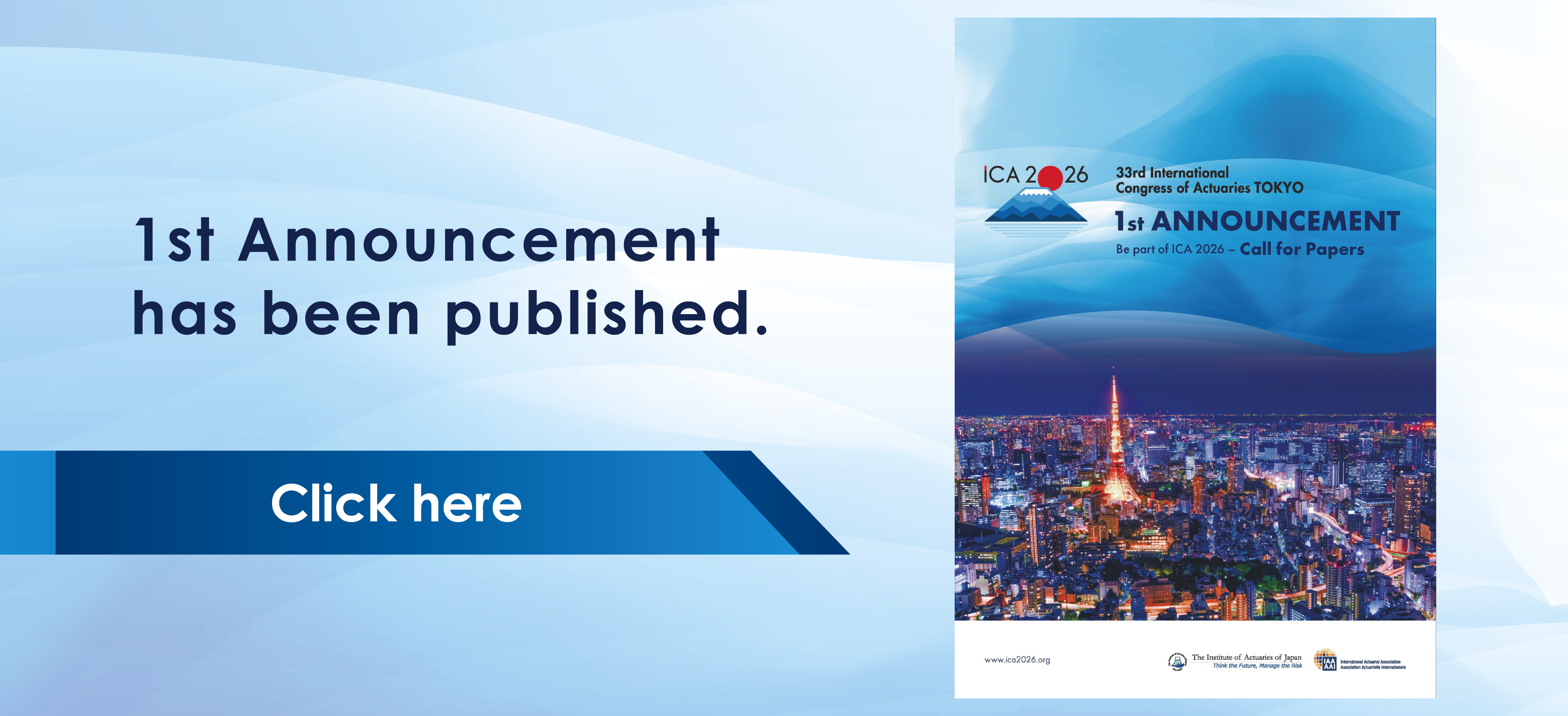 The 33rd International Congress of Actuaries (ICA2026) will be held in Tokyo, Japan hosted by The International Actuarial Association and The Institute of Actuaries of Japan. This website will be updated with various information about ICA2026. Please join our mailing list and stay up-to-date on the latest information!